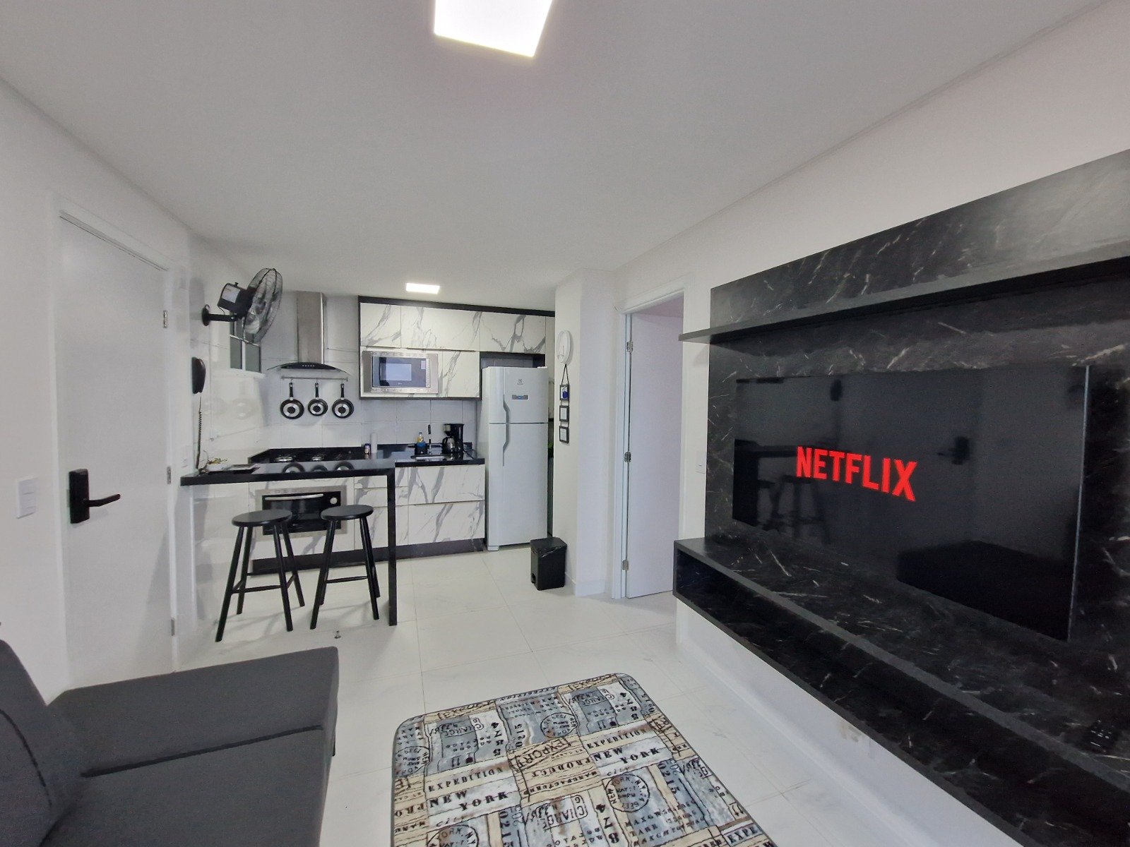 Sala ampla integrada com com cozinha